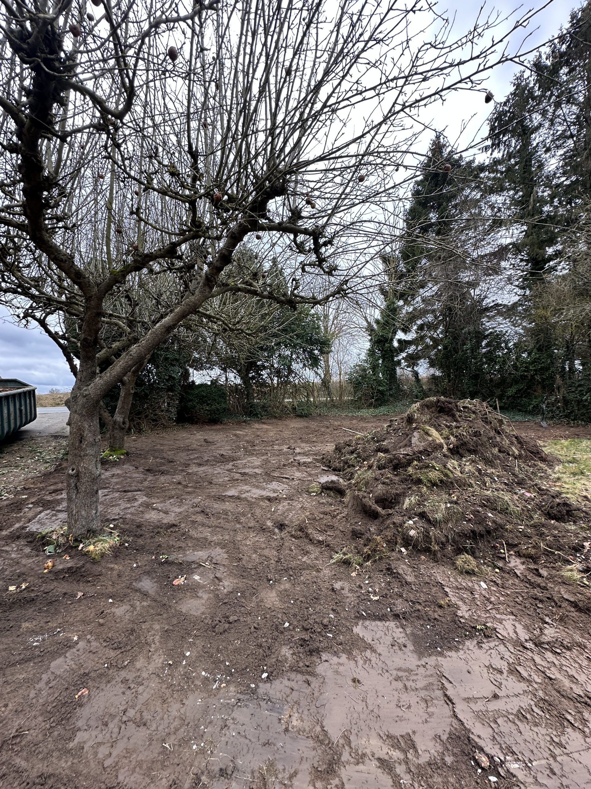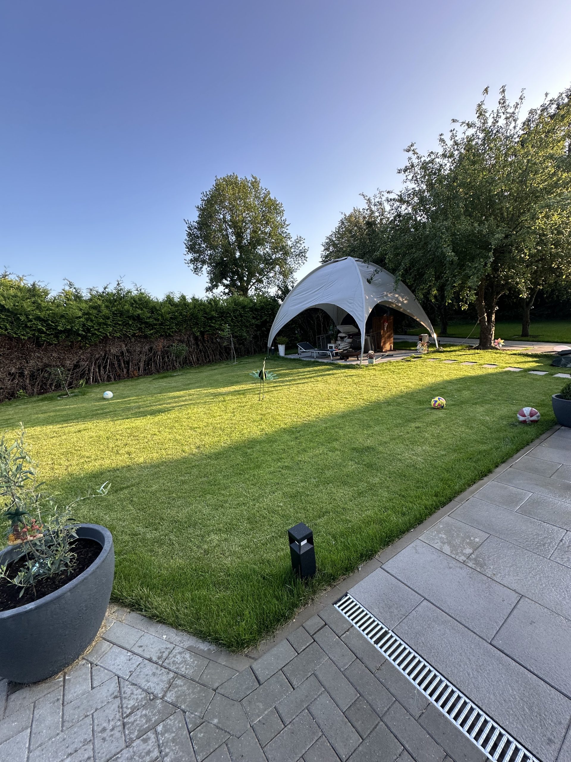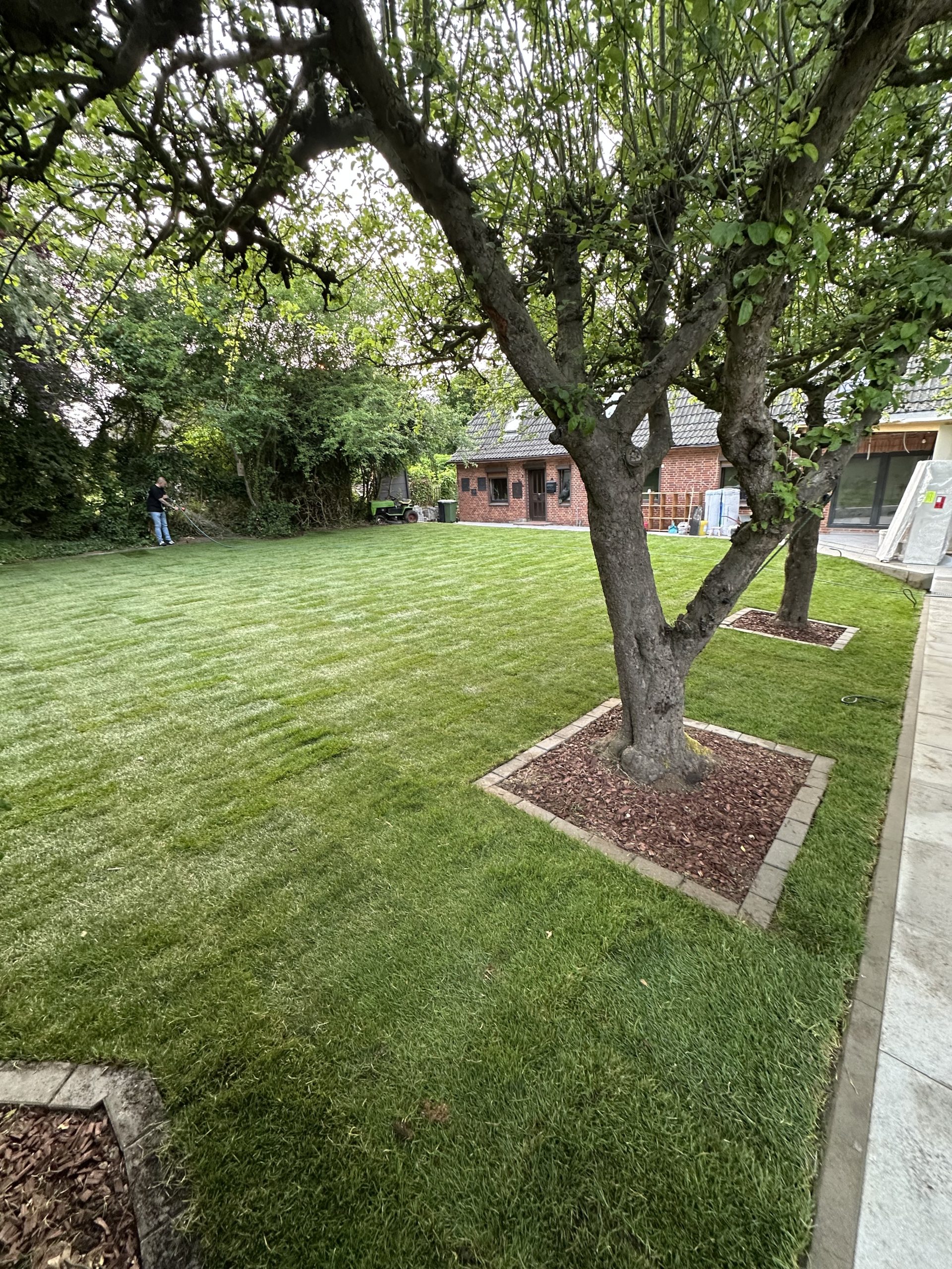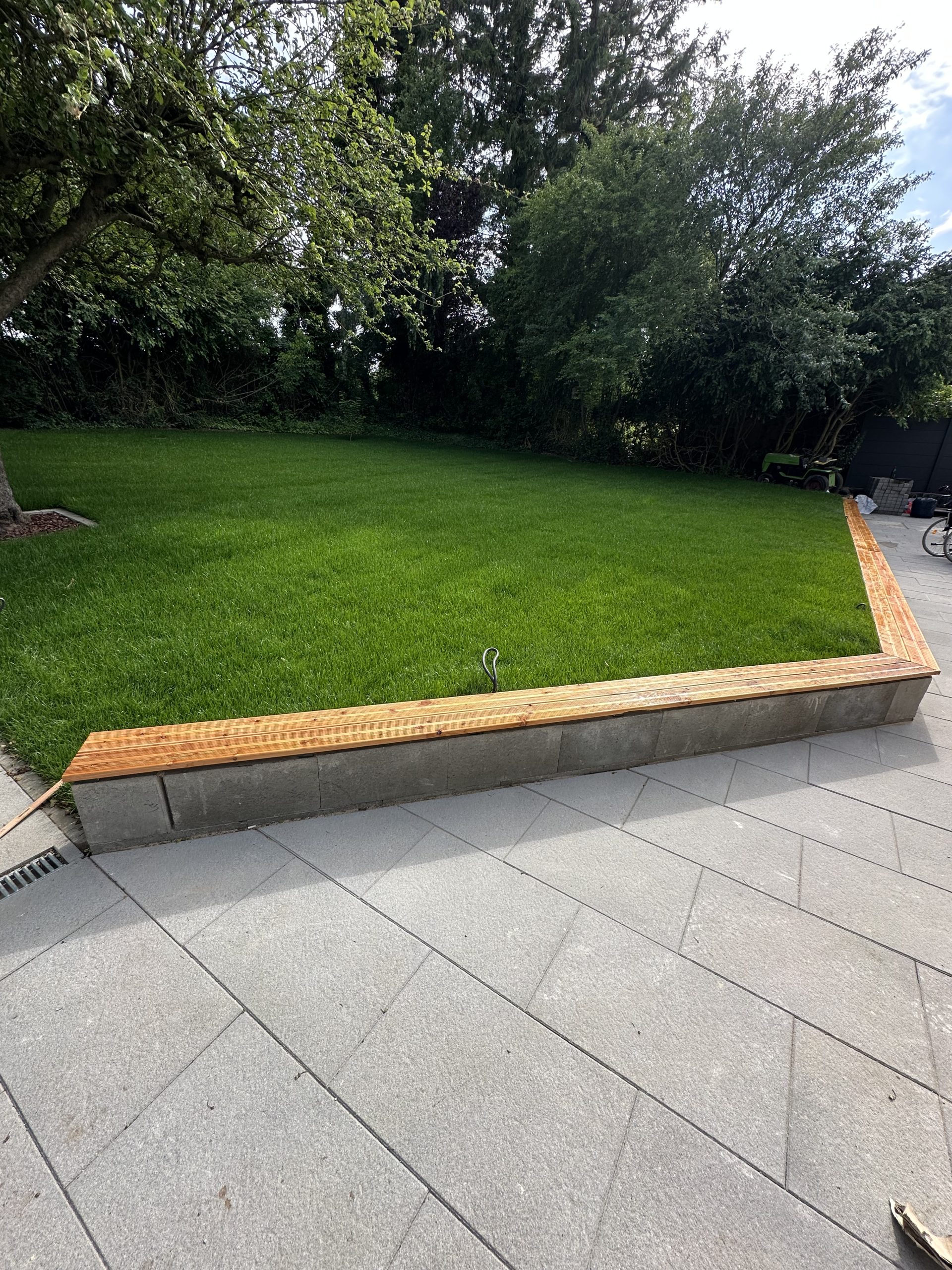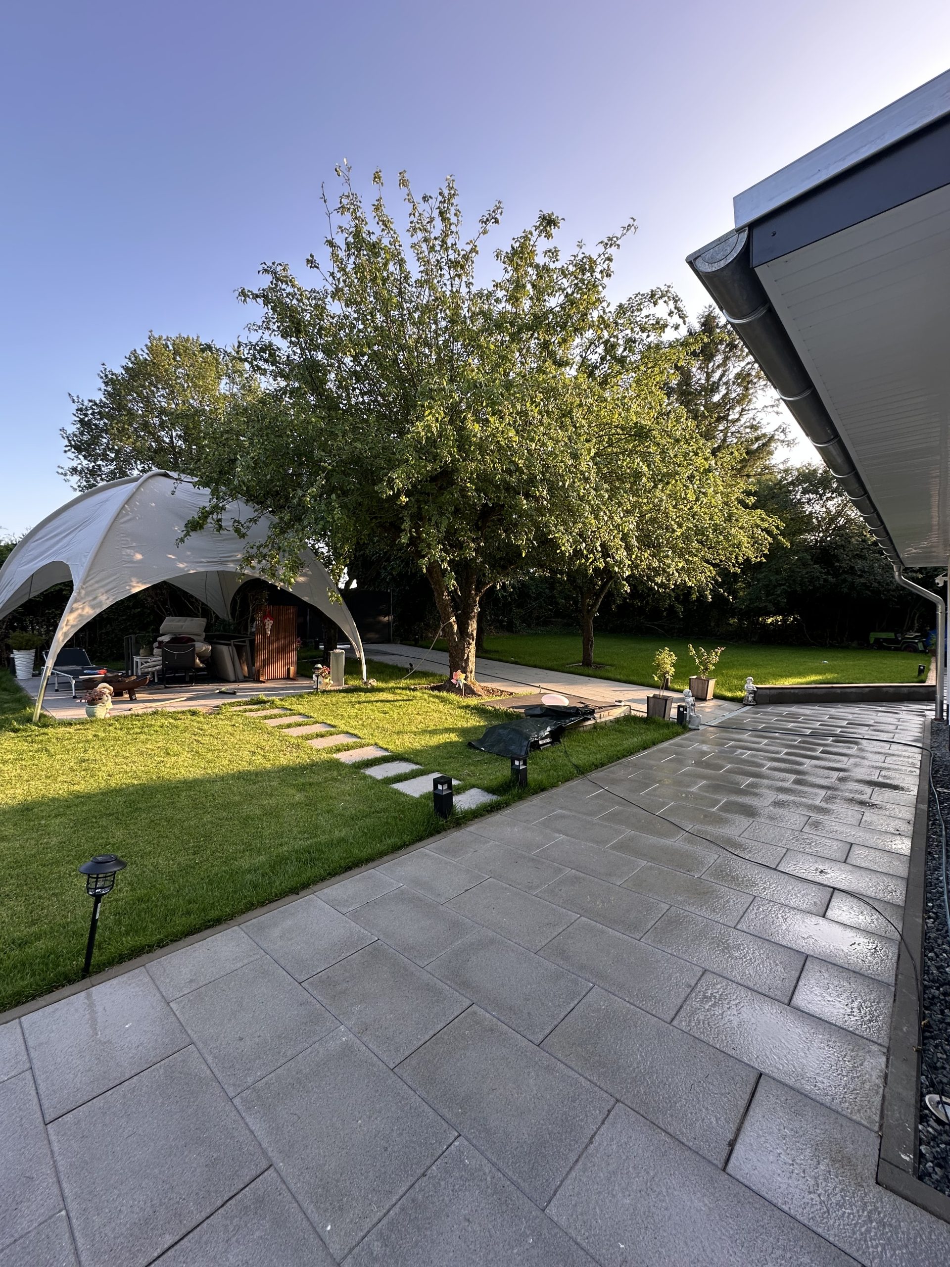 In Passade wurde ein ca. 810 m² großes Grundstück vollständig neu angelegt. Nach der Begradigung des Grundstücks erfolgten umfangreiche Pflasterarbeiten mit Betonstein (20×10×8) für Wege, Zufahrten und Nutzflächen. Zusätzlich entstand eine Terrasse aus grauen Betonplatten (60×30×4) sowie eine vorbereitete Fläche für einen Pavillon.