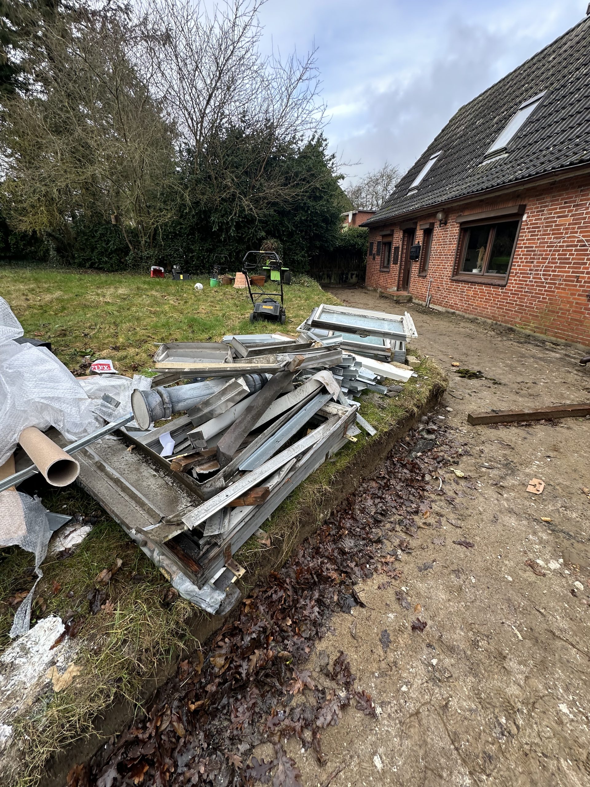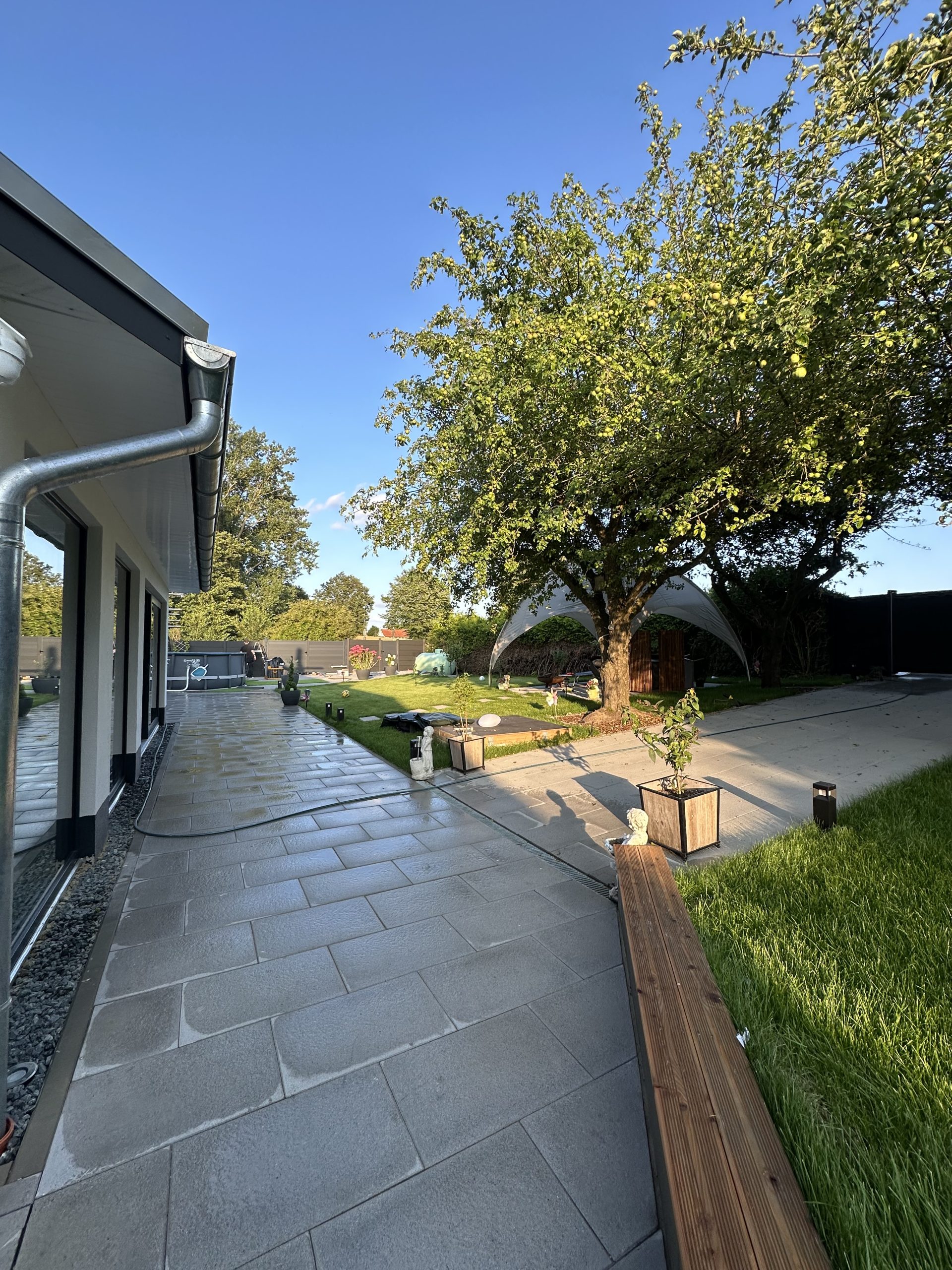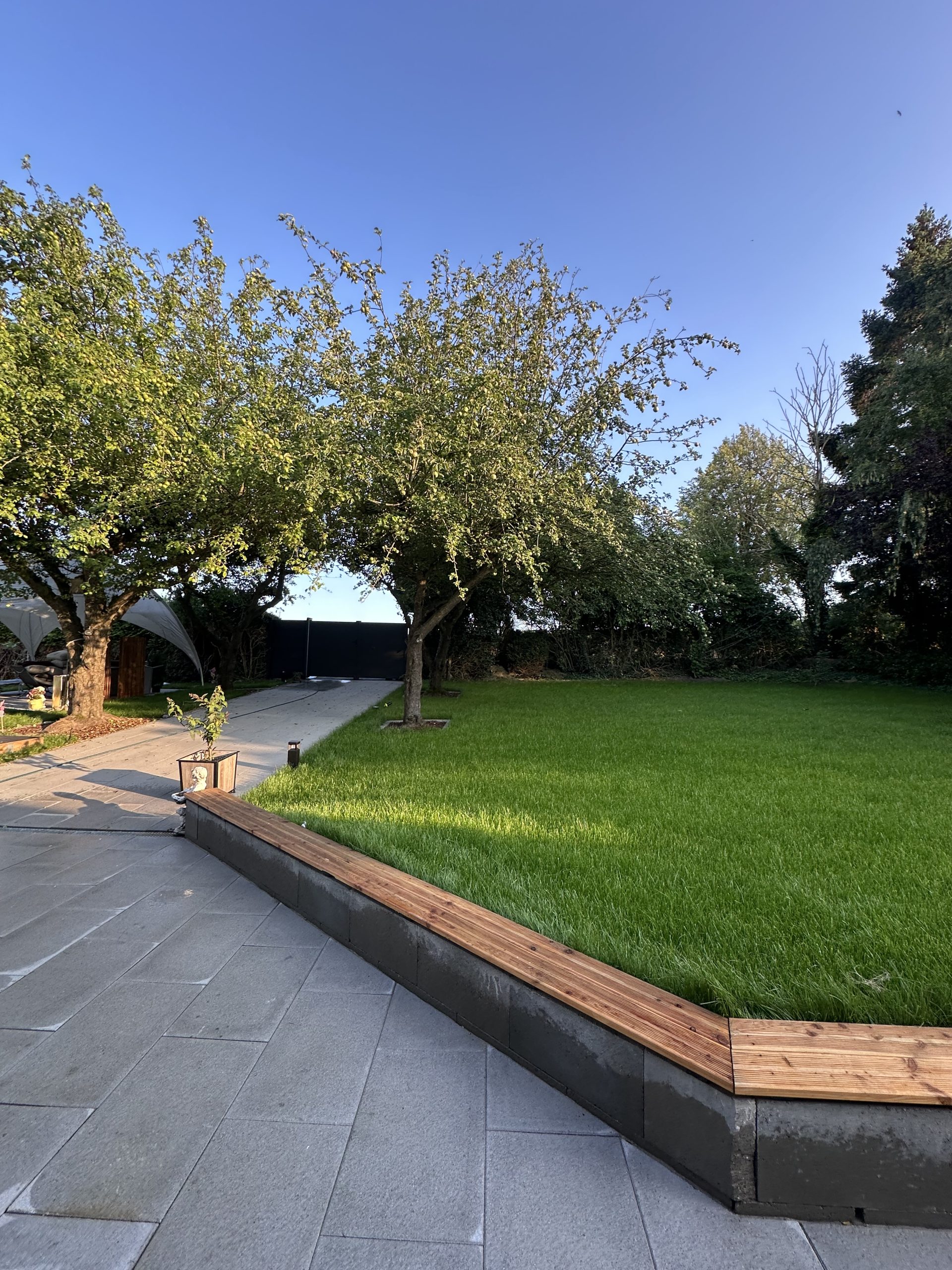 Für eine zuverlässige Entwässerung wurden ACO-Entwässerungsrinnen verbaut, Regenwasserleitungen verlegt und fachgerecht an den vorhandenen Schacht angeschlossen. Abschließend wurden Rollrasenflächen angelegt, WPC-Zäune gesetzt und elektrische Tore installiert, wodurch eine moderne, pflegeleichte und funktionale Außenanlage entstand.