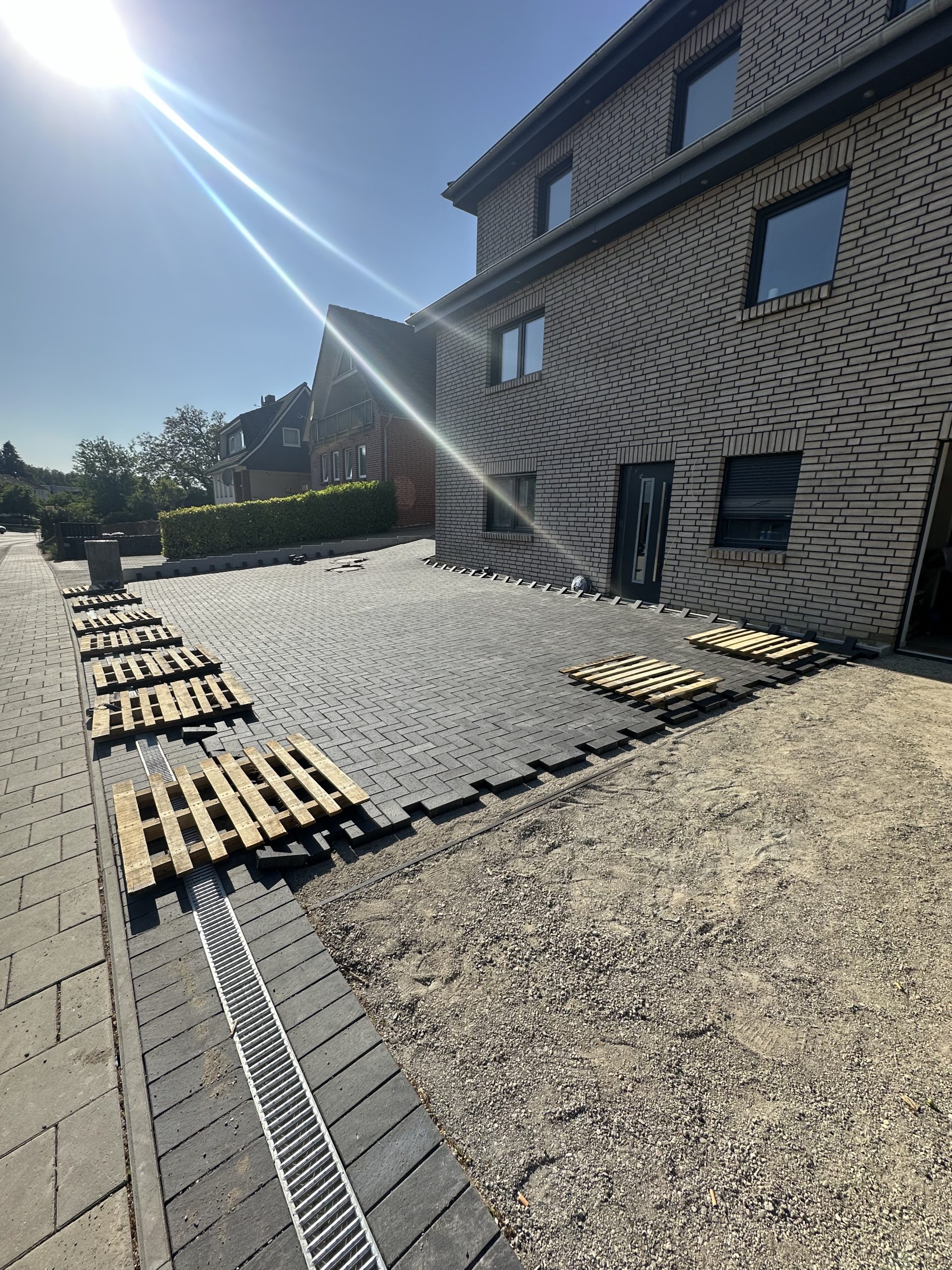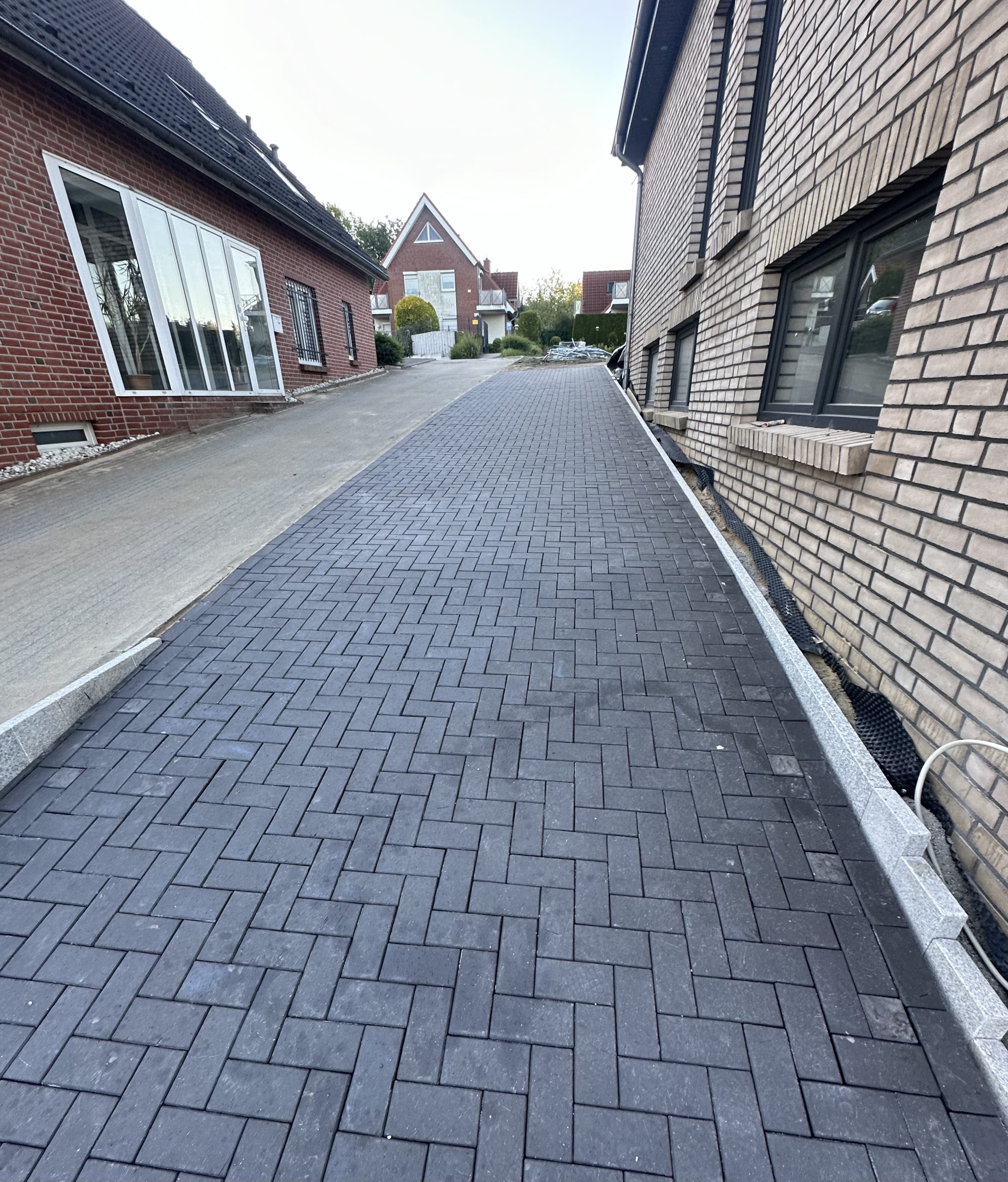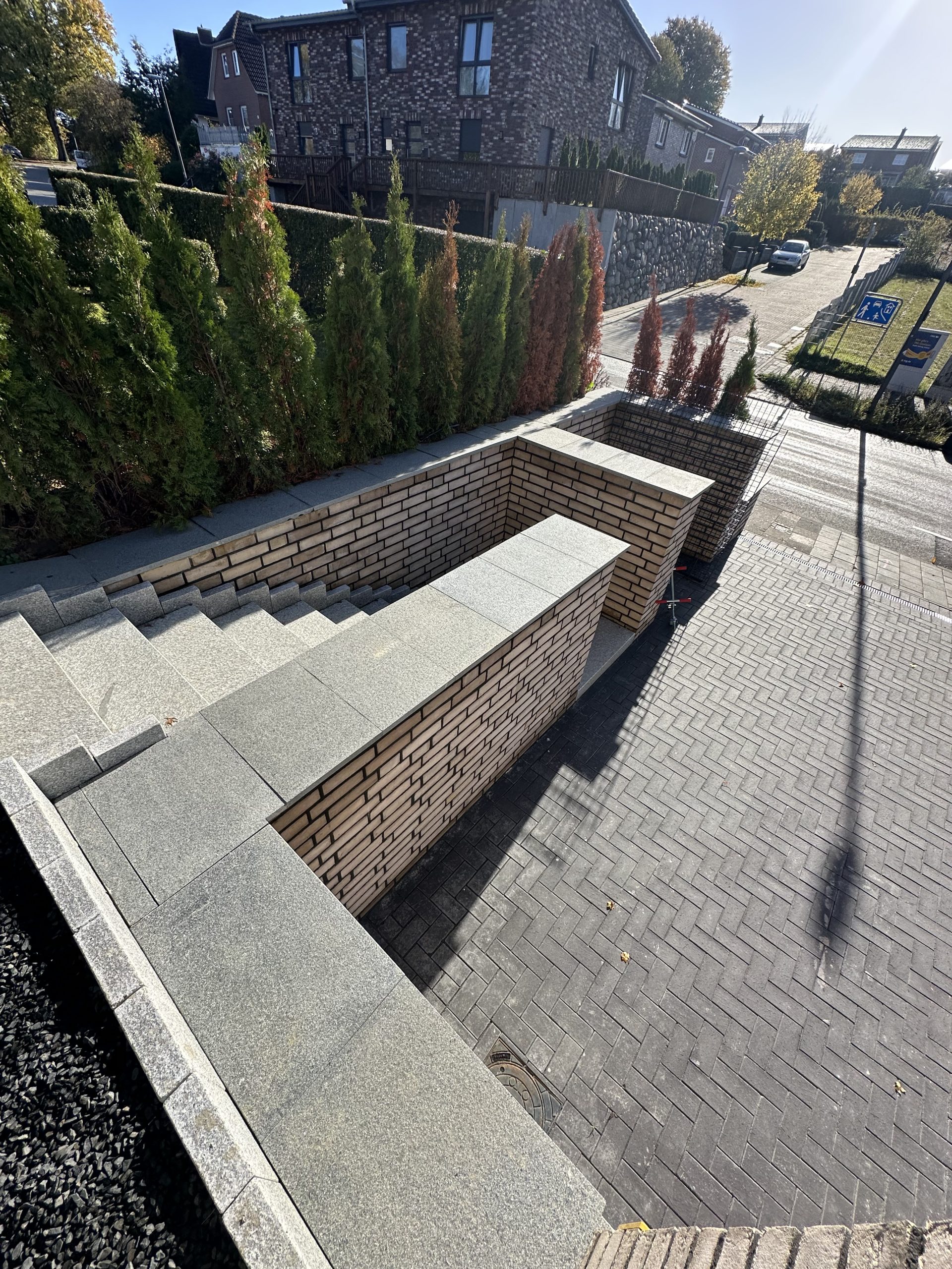 In Wellsee wurde ein ca. 900 m² großes Grundstück vollständig neu gestaltet. Nach der Begradigung des Grundstücks erfolgten umfangreiche Pflasterarbeiten mit Klinkerstein Milano (20×10×5,2) für Wege, Terrassen- und Nutzflächen. Im Eingangsbereich entstand eine hochwertige Außentreppe aus Granit-Blockstufen (100×35×16), die den Höhenunterschied funktional und optisch ansprechend ausgleicht.
