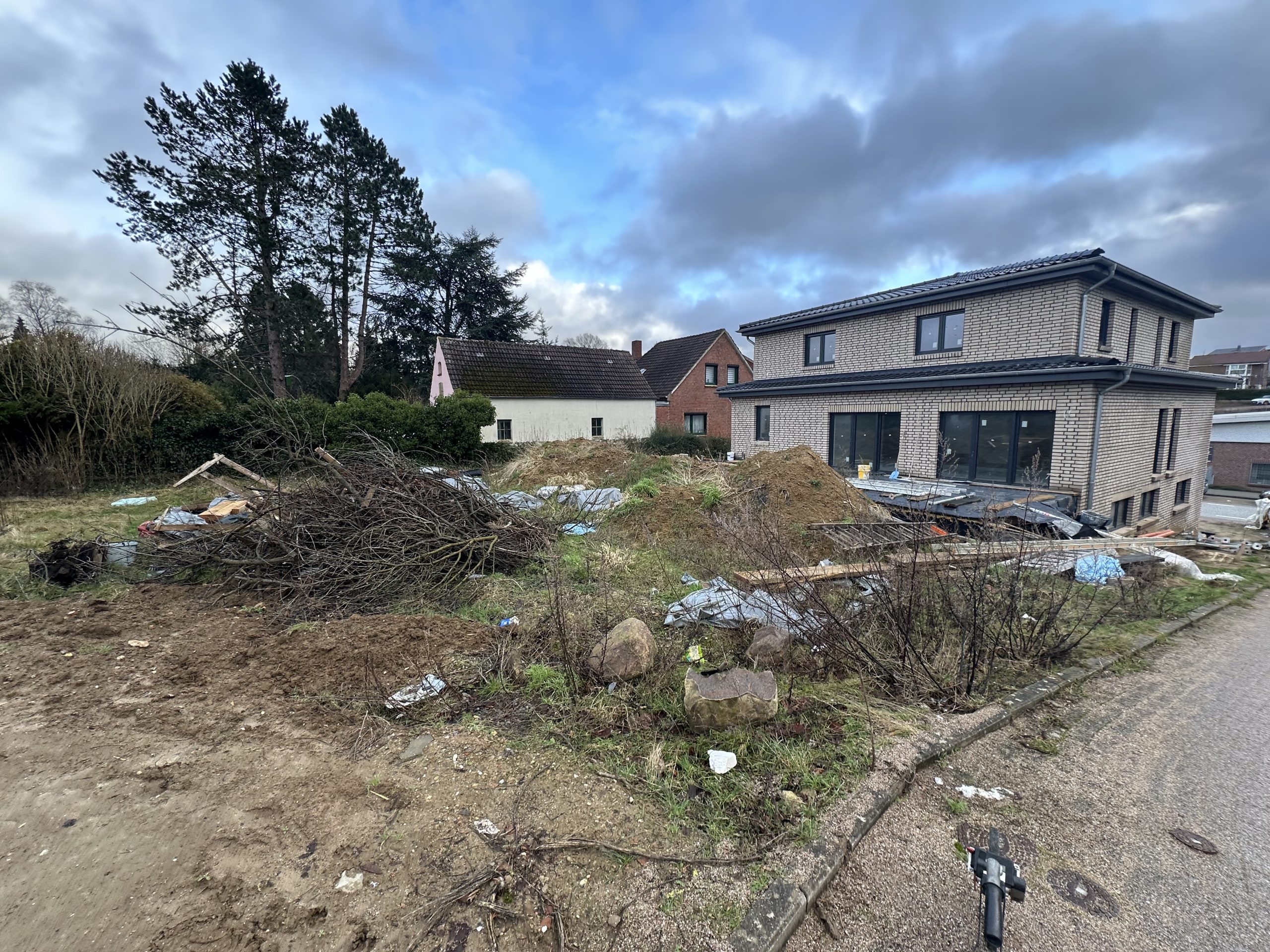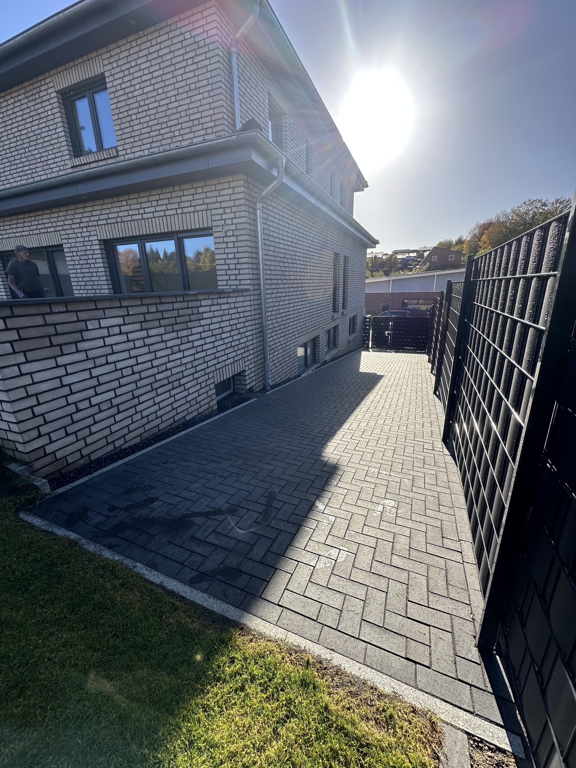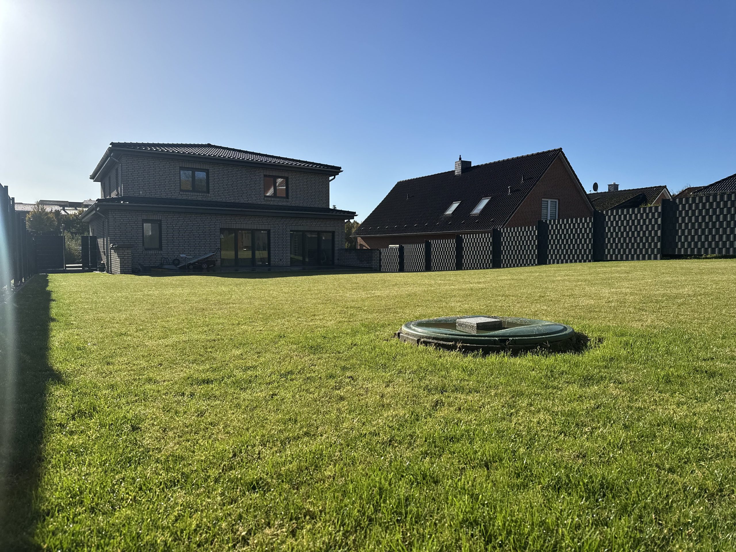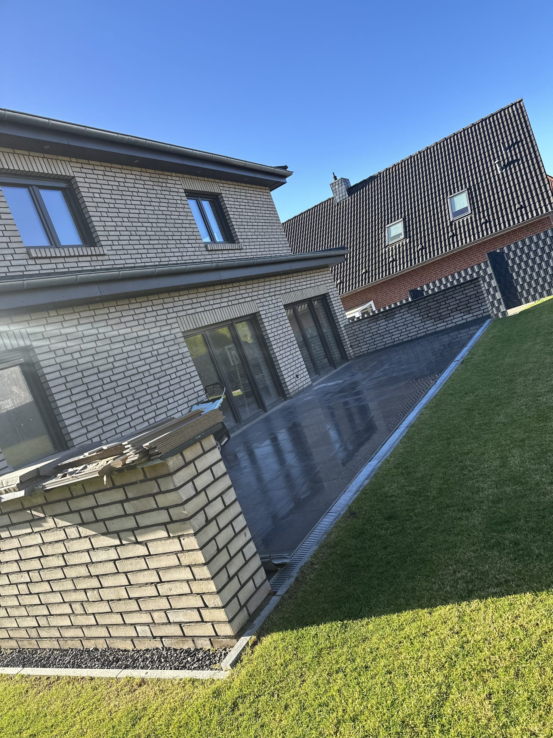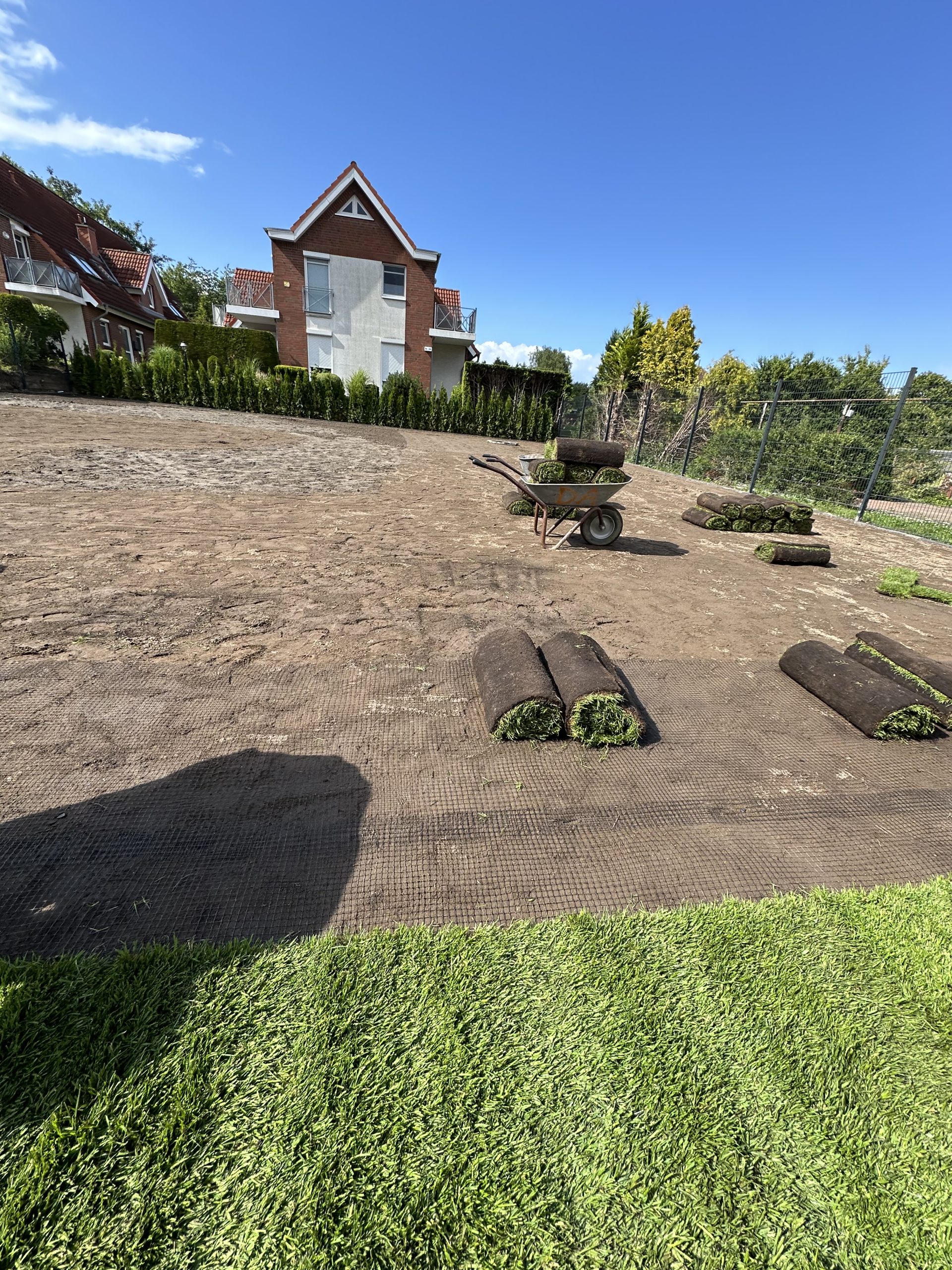 Für eine sichere Entwässerung wurden ACO-Entwässerungsrinnen verbaut, Regenwasserleitungen verlegt und an den vorhandenen Schacht angeschlossen. Zusätzlich wurden Doppelstabmattenzäune gesetzt sowie eine Gartenmauer mit Verblendern errichtet. Abschließend folgten die Verlegung von Rollrasen, die Installation eines Gardena-Bewässerungssystems und die Verkabelung für einen Mähroboter – so entstand eine moderne, strukturierte und pflegeleichte Außenanlage.